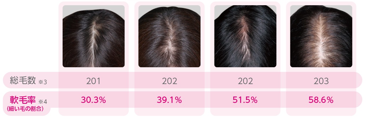 ※4 軟毛率:1㎠あたりの総毛数における軟毛数の割合(軟毛数/総毛数)本試験における軟毛:太さ40㎛未満の細い髪の毛