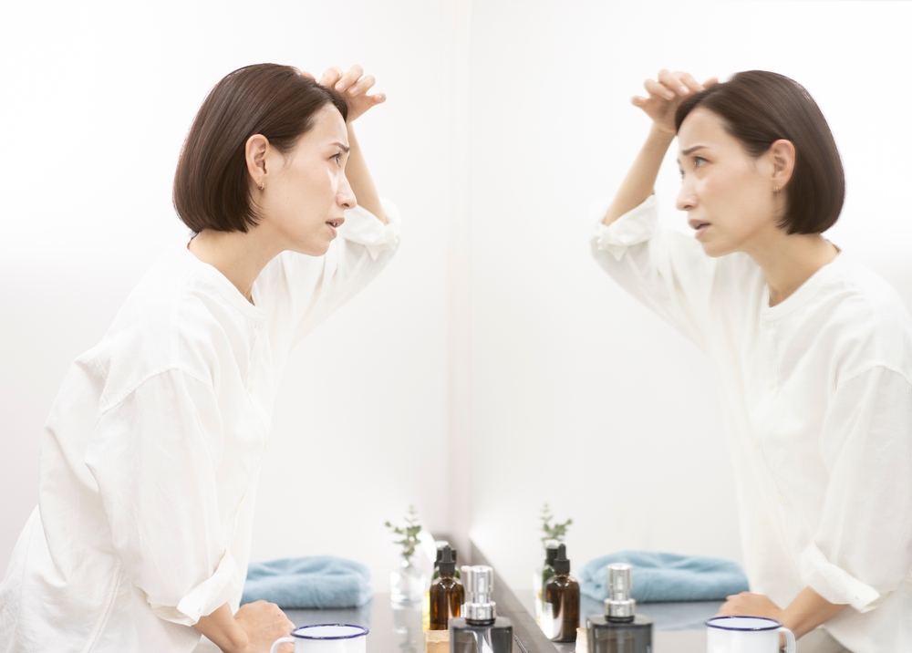 薄毛の原因はさまざまあり、ストレスによる円形脱毛症や甲状腺機能異常症、女性型脱毛症(FAGA)などがありますが、頭頂部の分け目が気になり始めるのは「壮年性脱毛症」かもしれません。