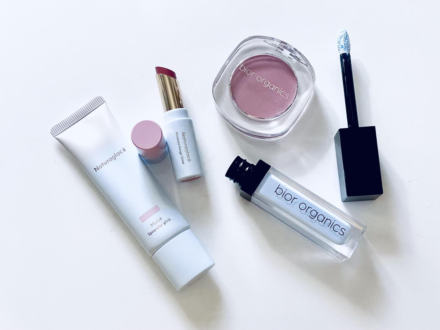 そろそろ春夏のメイクに本格的にシフトチェンジしたいとき。ナチュラルコスメブランドのメイクの新作が注目です。最近のメイクトレンドは、肌のくすみをやわらげながら、透明感のあるピュアな仕上がりにすること。ラベンダー系やペールブルー(水色)系などの青みのあるカラーを取り入れたベースメイクや、ほんのりツヤのあるチーク、透け感があって美肌に見せてくれるリップなどが人気です。
