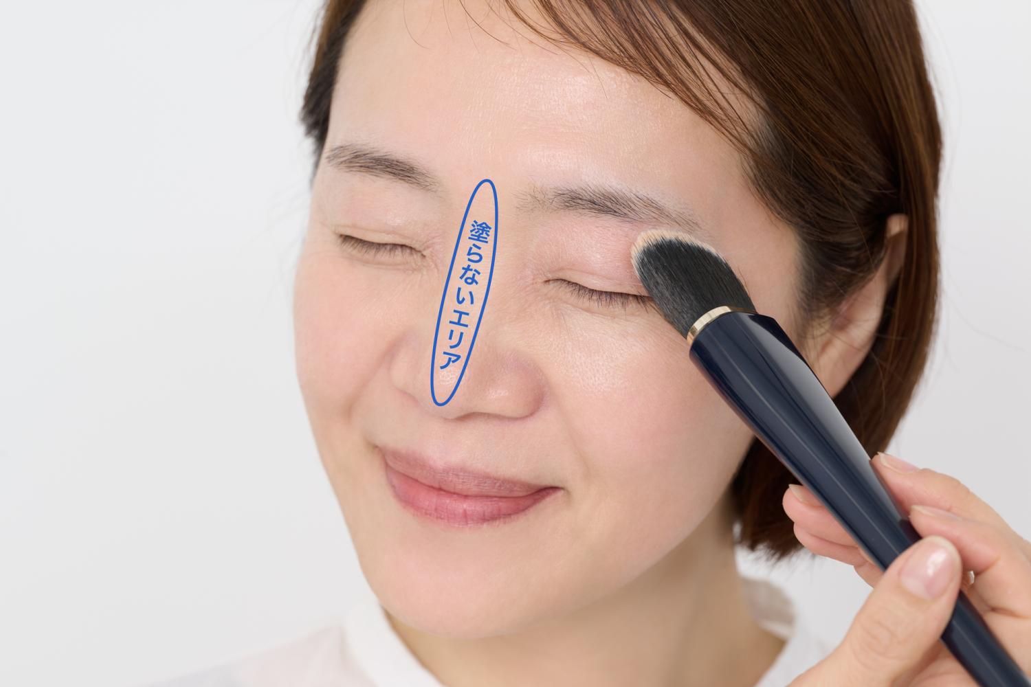 「プロセス2で『三つ葉形』に置いたファンデーションの境目をブラシでぼかすと、上向き半円形の『かまぼこ形』になります。