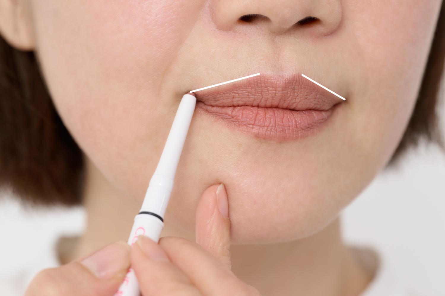 上唇の山の部分と下唇中央のラインに影色リップライナーを使って、上唇はオーバーラインに描くのがコツ。