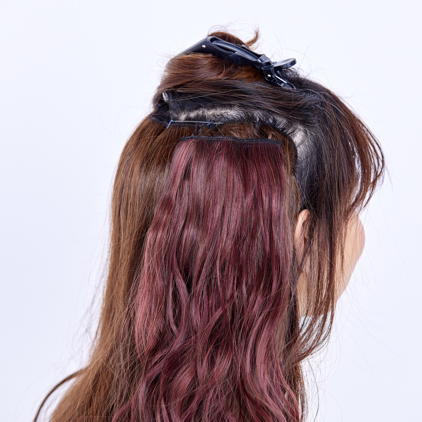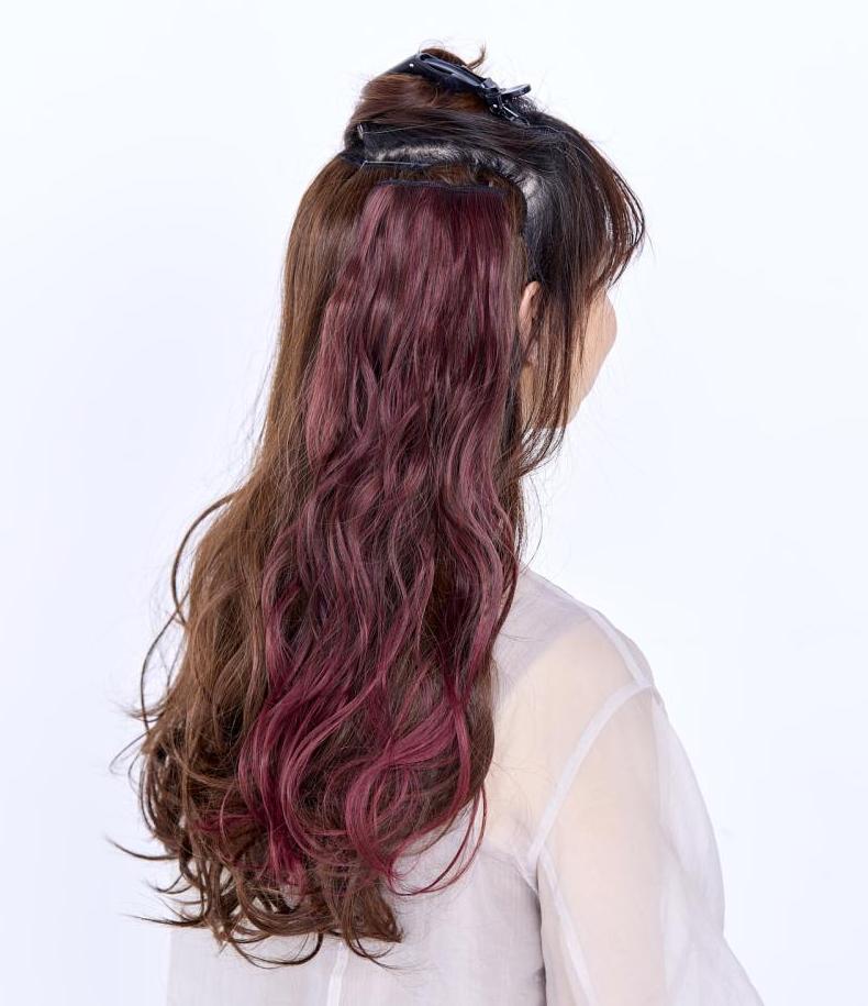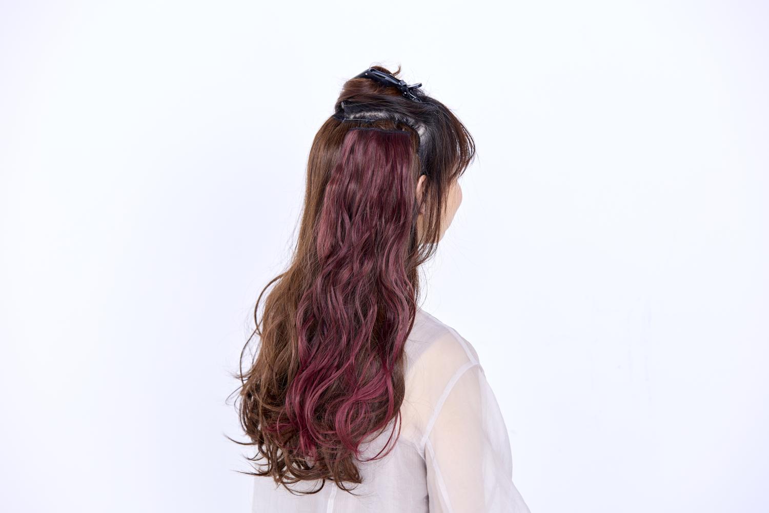 プロセス1で後頭部につけたヘアピースの上に重ねるようにして、ピンクのエクステを右のサイドに装着。