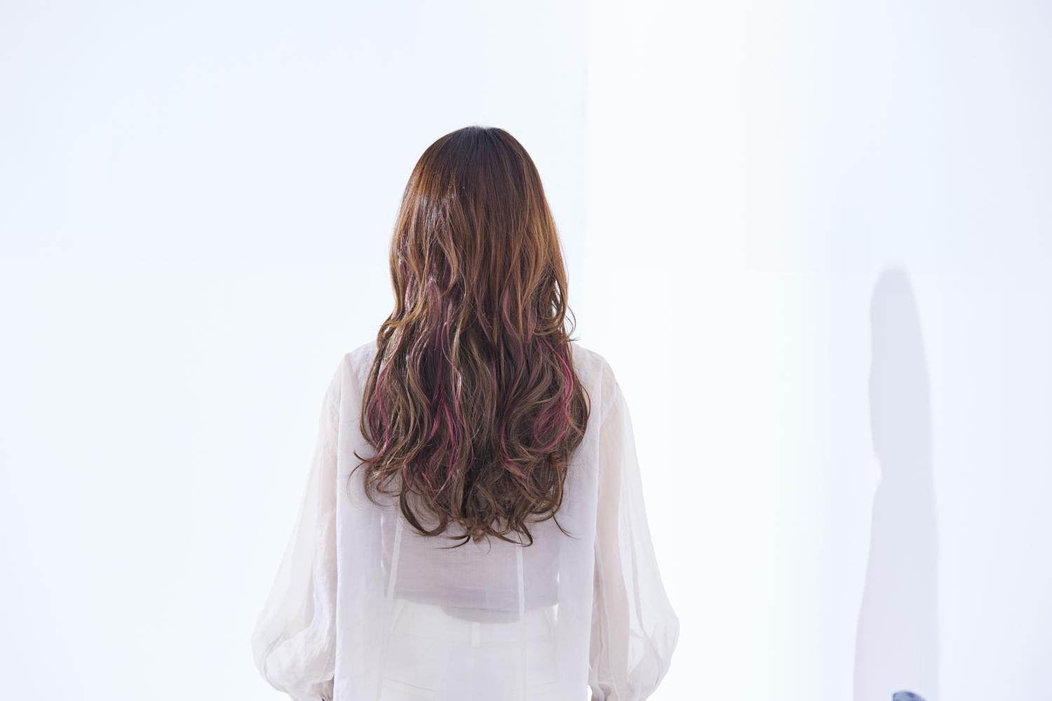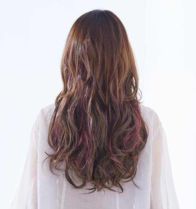 ダークブラウンのボリューミーなロングウエーブに、チラリとのぞくピンクのハイライト。