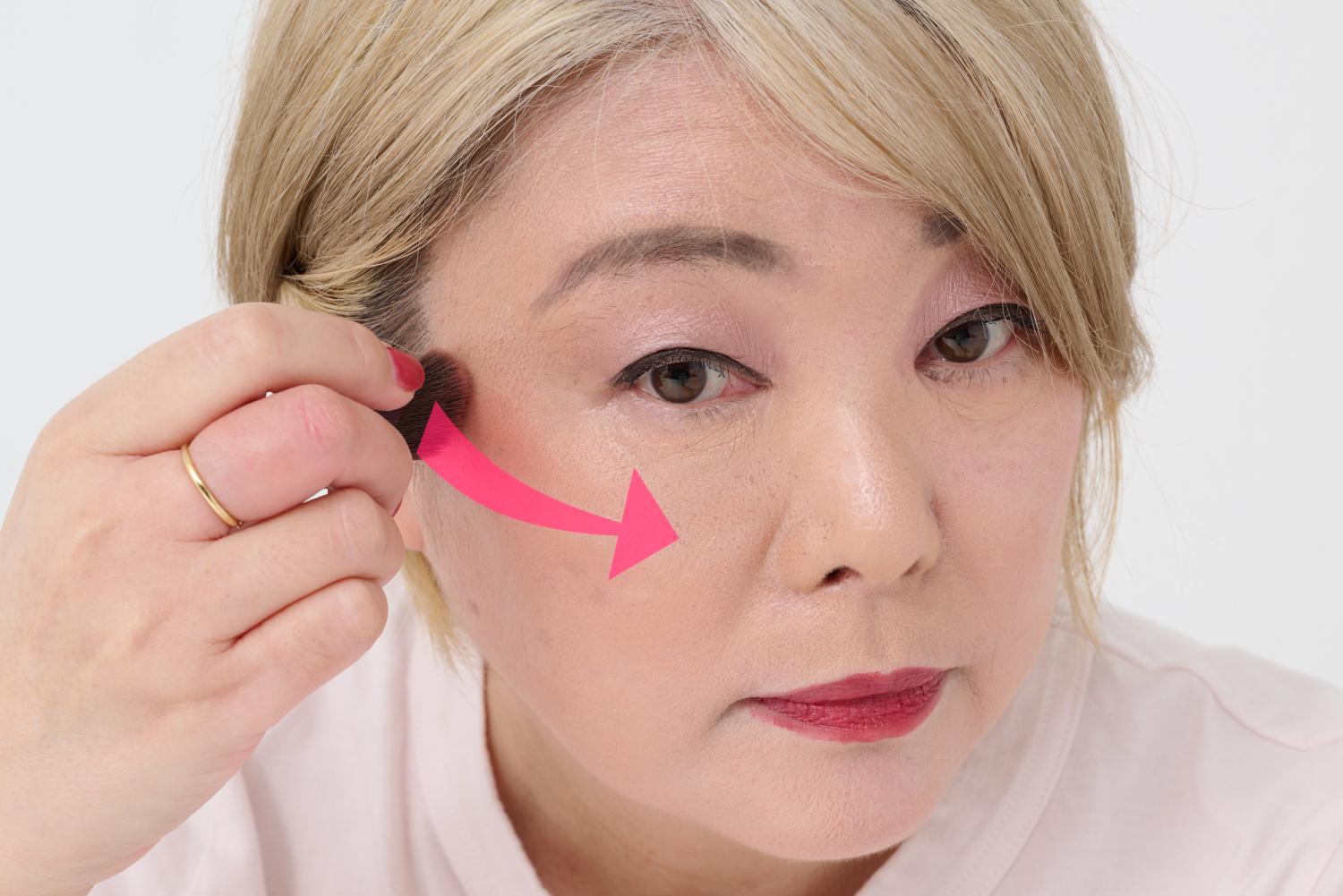 それは、「(チークを)下に向かって塗ると、ほうれい線が目立つ」ということ!