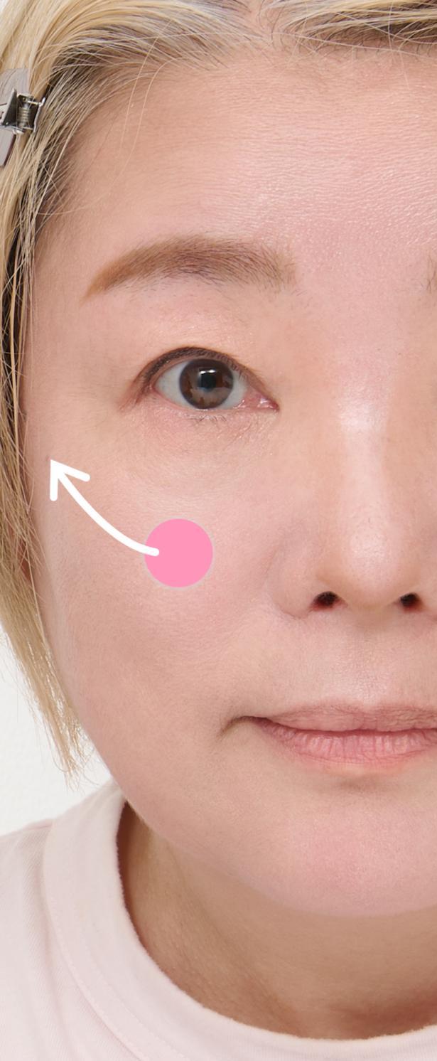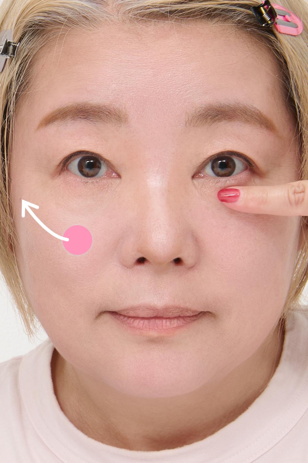 初美:せっかくチークをつけていても、下に落ちる流れを作ってしまうことで老け見えしてしまうのですよ。