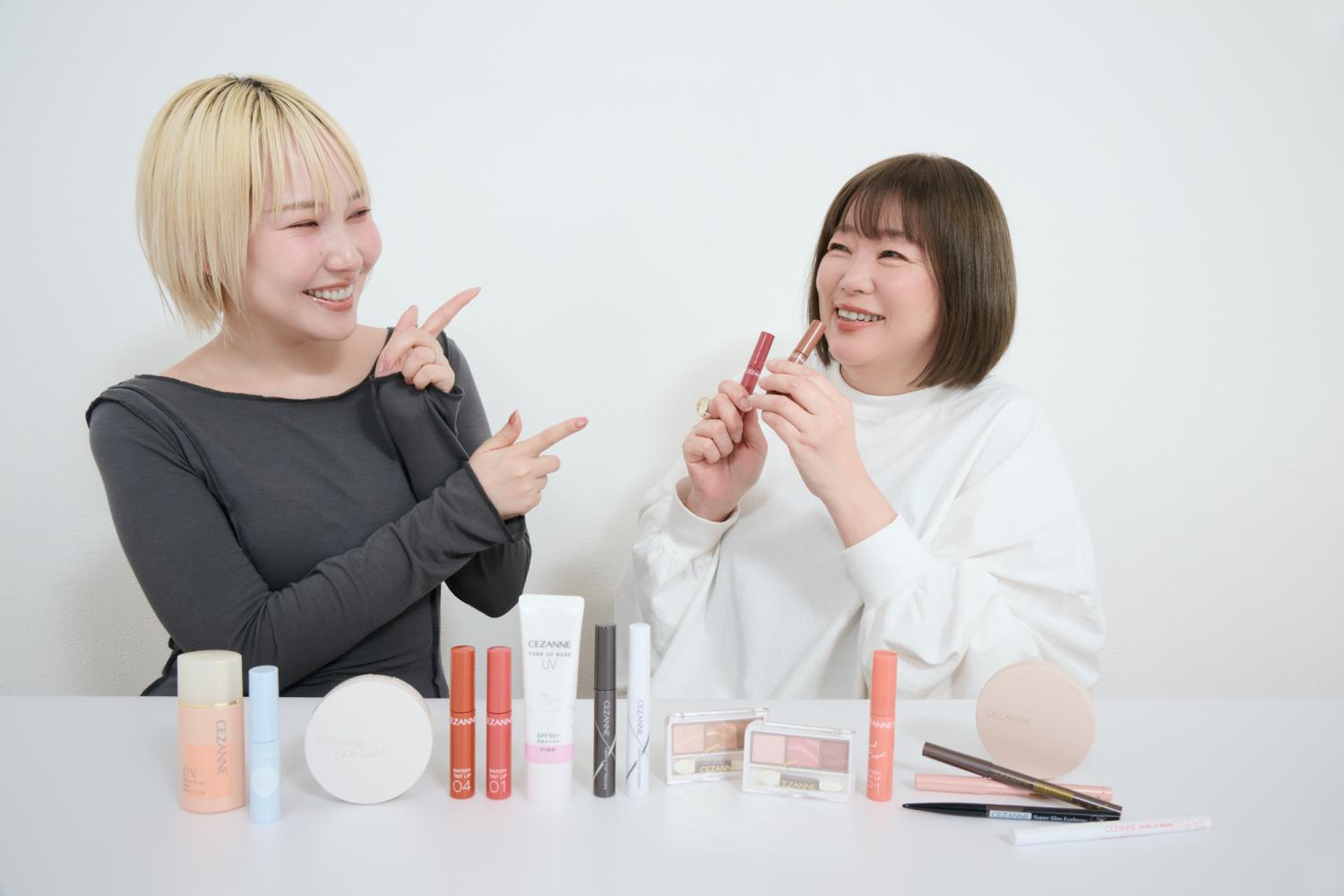 セザンヌの名品コスメを並べて盛り上がる、初美メアリさんとイオちゃん