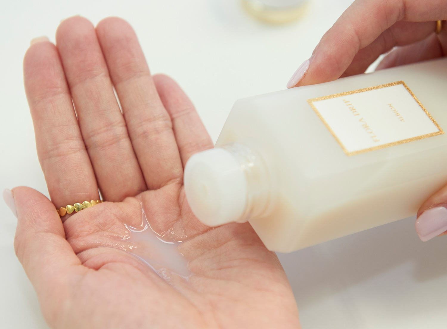 アルビオンでは、洗顔後にまず乳液をつけるのが基本なので、その後に、『フローラドリップ s』を手のひらにとり、両手をすり合わせてから、やさしく密着させて引き上げるようになじませるというステップを2回くり返します。こうするようになってから、肌の調子が落ち着いてきました。