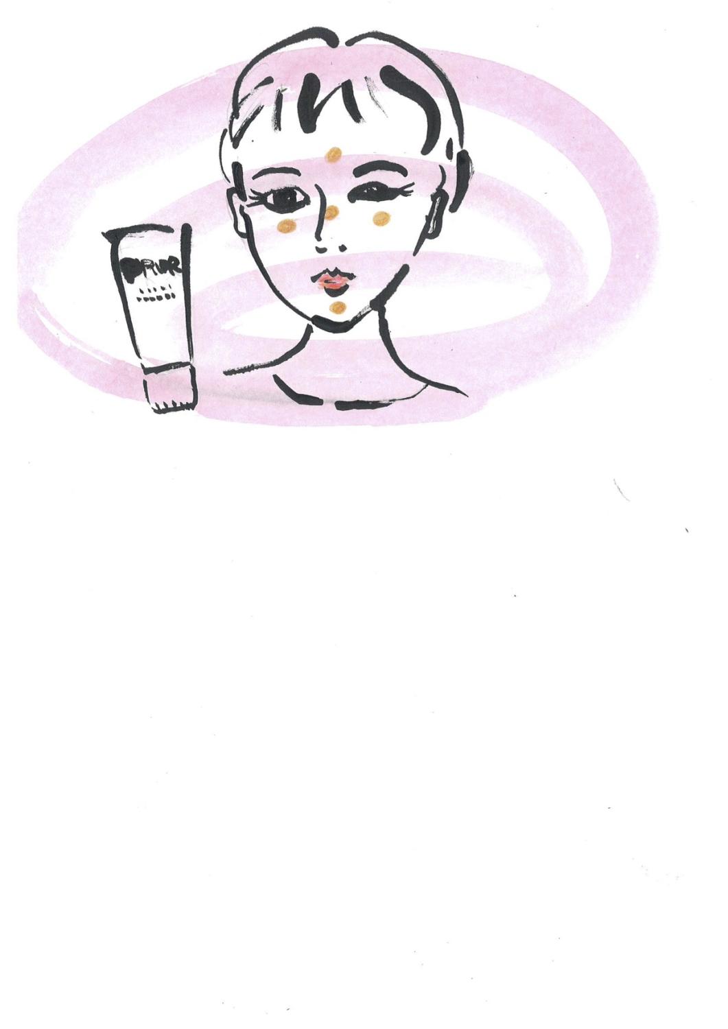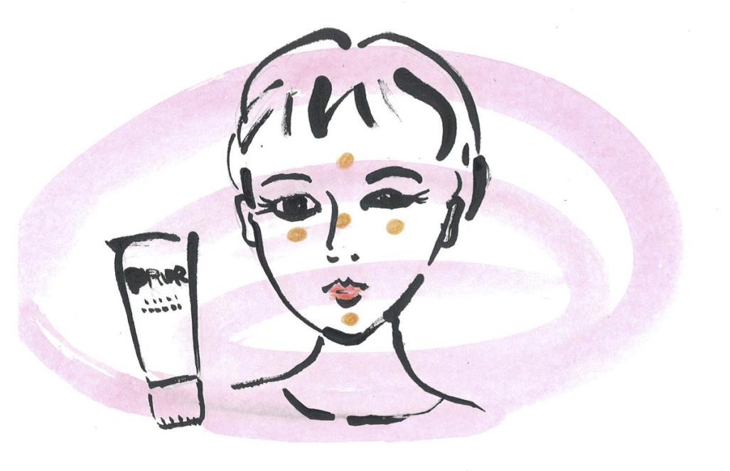 スキンケアで肌を整えたあと、指先に小さなパール粒1個分を取り、額、鼻、両頰、あごの5カ所に置きます。