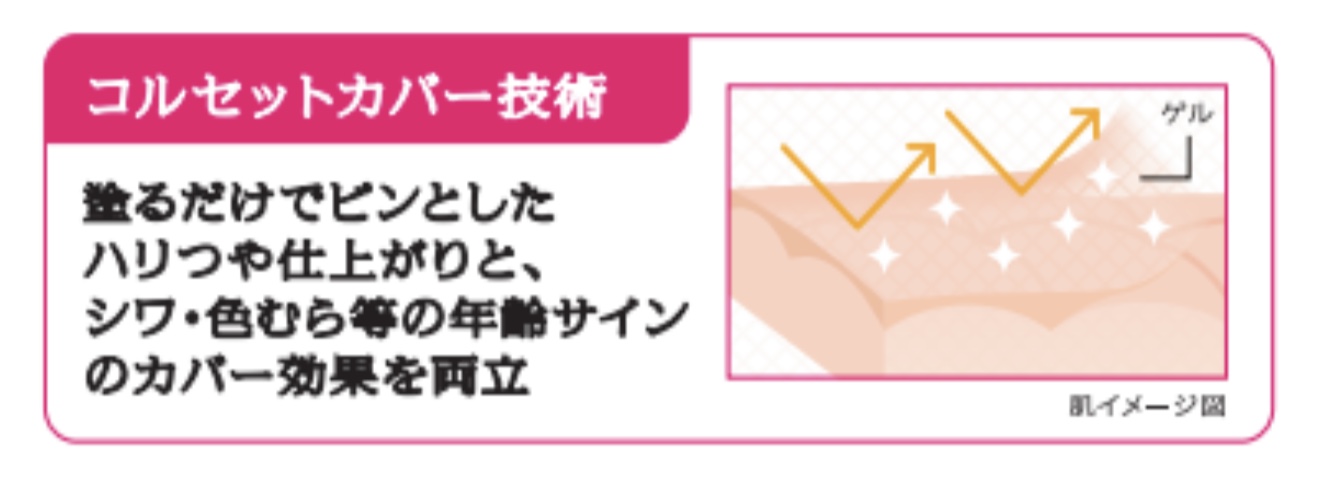ファンデーションを肌にのばすと余分な油分が飛び、コルセットゲルが固定されてハリをもたらし、ピンとした仕上がりに。