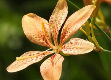 ヒオウギは、アヤメ科アヤメ属の多年草であり、夏には赤い斑点のあるオレンジ色の花を咲かせます(下写真はそのイメージ)。