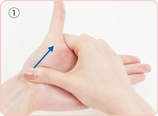 ① 親指の付け根のふくらみ部分に、もう片方の手の親指で心地よい圧をかけながら、手の付け根から親指方向にスライドさせます。