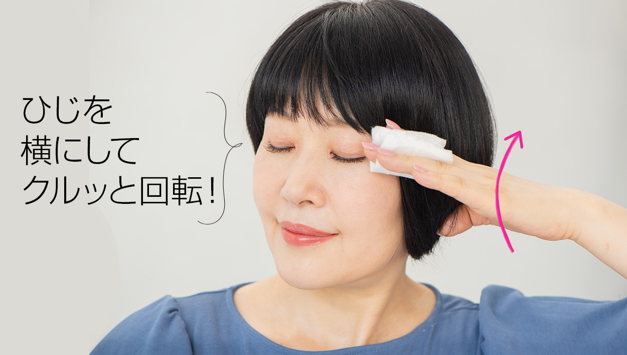 小林 ポイントメイクアップリムーバーを含ませたコットンを目元に当ててしばらくなじませ、手をクルッと回転させるんです。ひじを横にすると、回しやすいです。